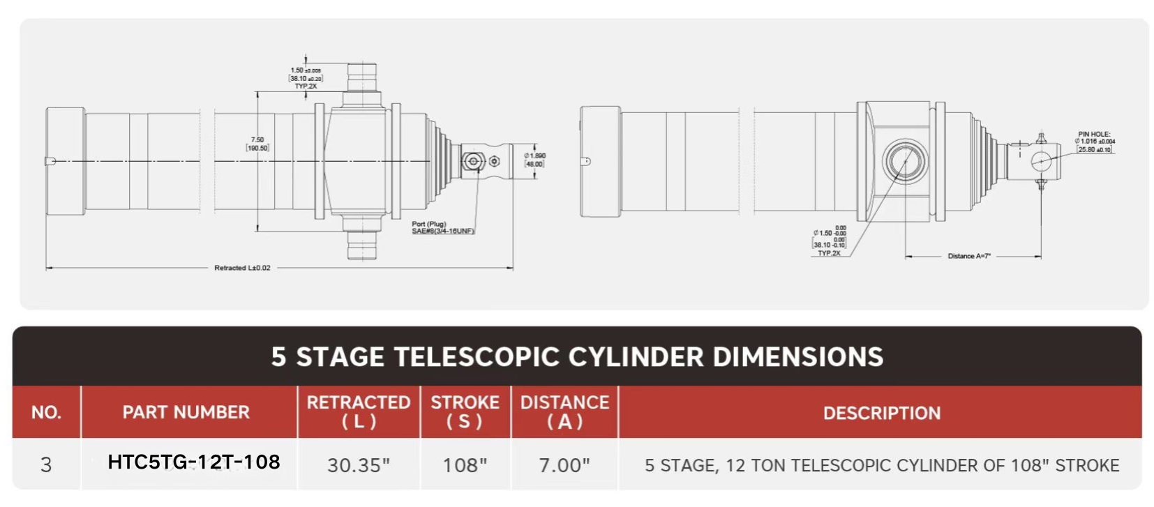 Телескопічний циліндр "HTC5TG-12T-108", 5 ступенів, 12 тонн із ходом 108 дюймів