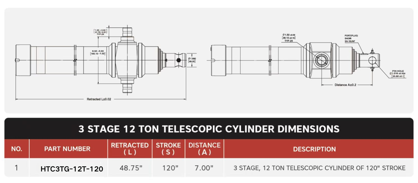 "HTC3TG-12T-120", 3-ступеневі телескопічні циліндри вагою 12 тонн і 120 дюймів