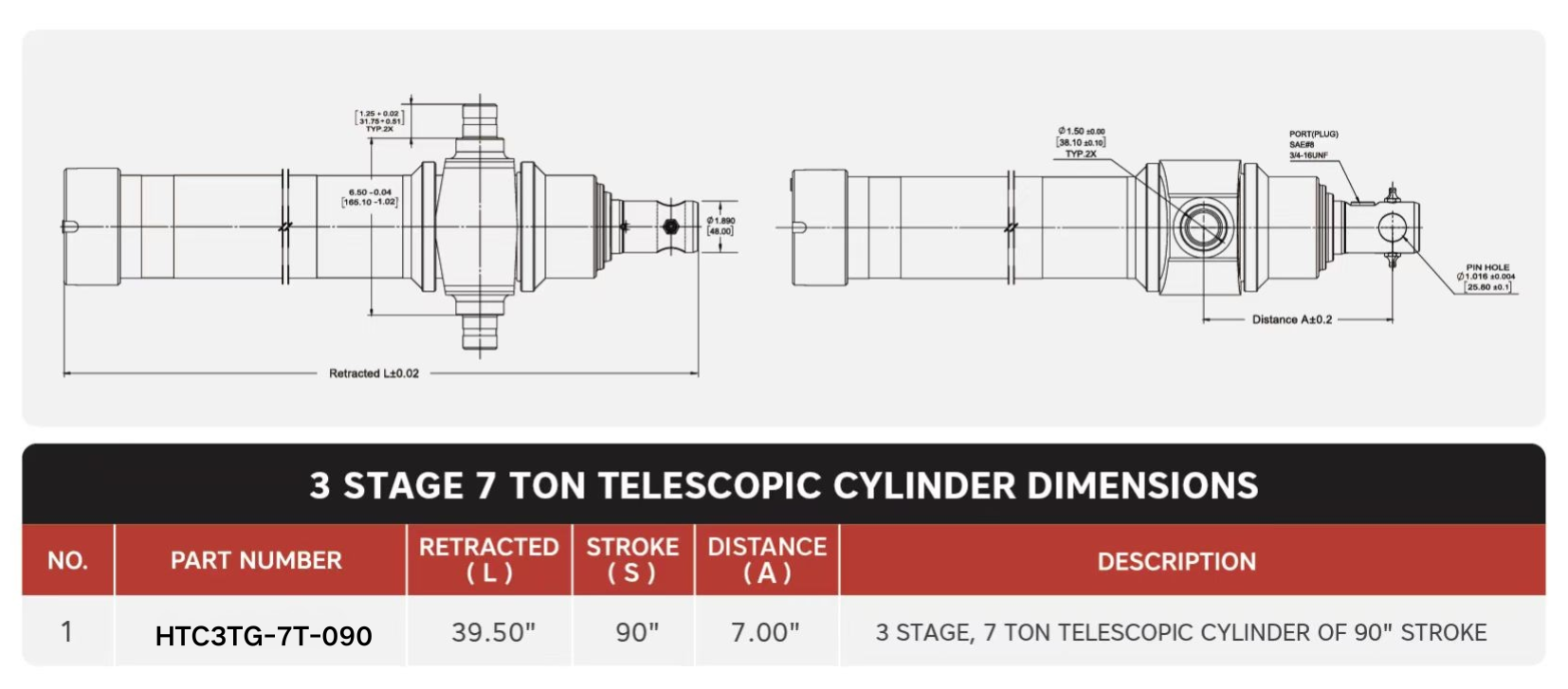 "HTC3TG-7T-090", 3-ступеневі телескопічні циліндри вагою 7 тонн і робочим ходом 90 дюймів